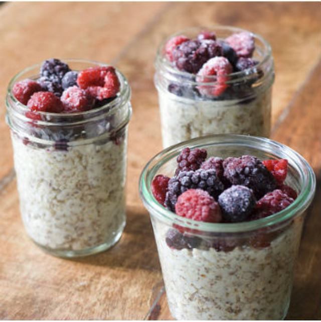 - Split in two and pour in two separate Mason jars. Top each jar with ½ cup (125mL) mixed berries. Refrigerate for at least 8 hours. Enjoy! Tip: This recipe can be served warm as well. To enjoy hot, microwave for 1 minute with mason jar lid off.
