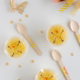 2. Arrange face as shown. The trick for the blueberries: Trim the bottoms so they sit flat. Cut one orange into slices. Pull the peel from two of the pieces and center one on each bunny ear.
